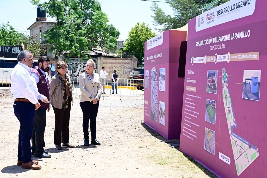 En el Parque “Jaramillo” en Tepotzotlán, primer lugar que visitó la Gobernadora Delfina Gómez Álvarez en una gira de trabajo que incluyó también los municipios de Teoloyucan y Melchor Ocampo, se construirán: dos módulos de vigilancia, andadores, una cancha de usos múltiples, frontón, un módulo sanitario, una cisterna, 19 cajones de estacionamiento y se colocarán 985 metros de rejas de acero, 30 bancas y 32 contenedores de basura, además se instalarán 68 luminarias solares.