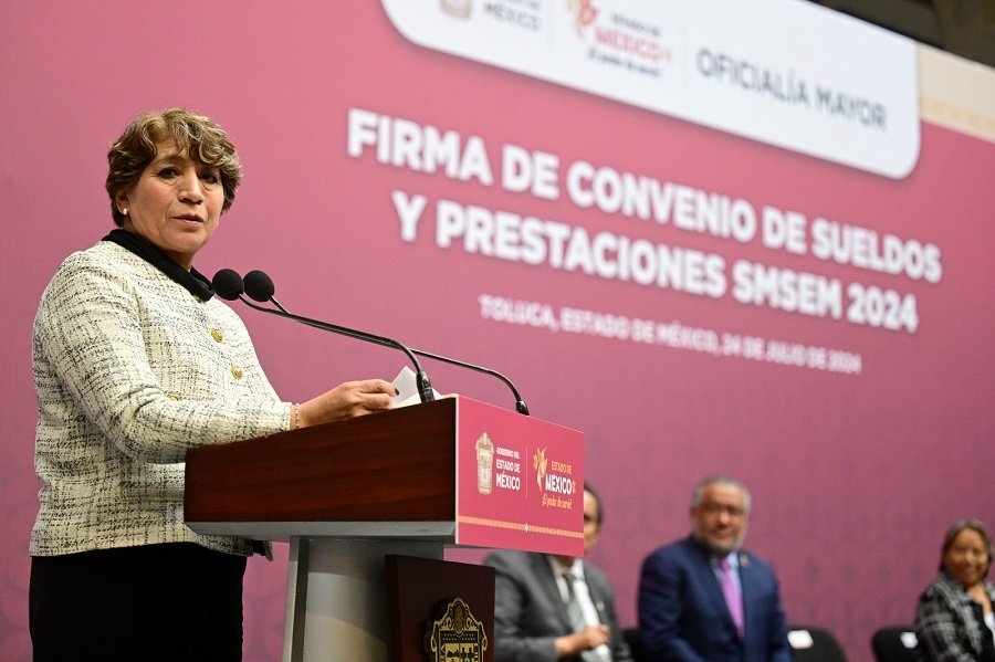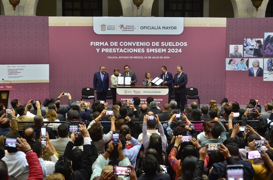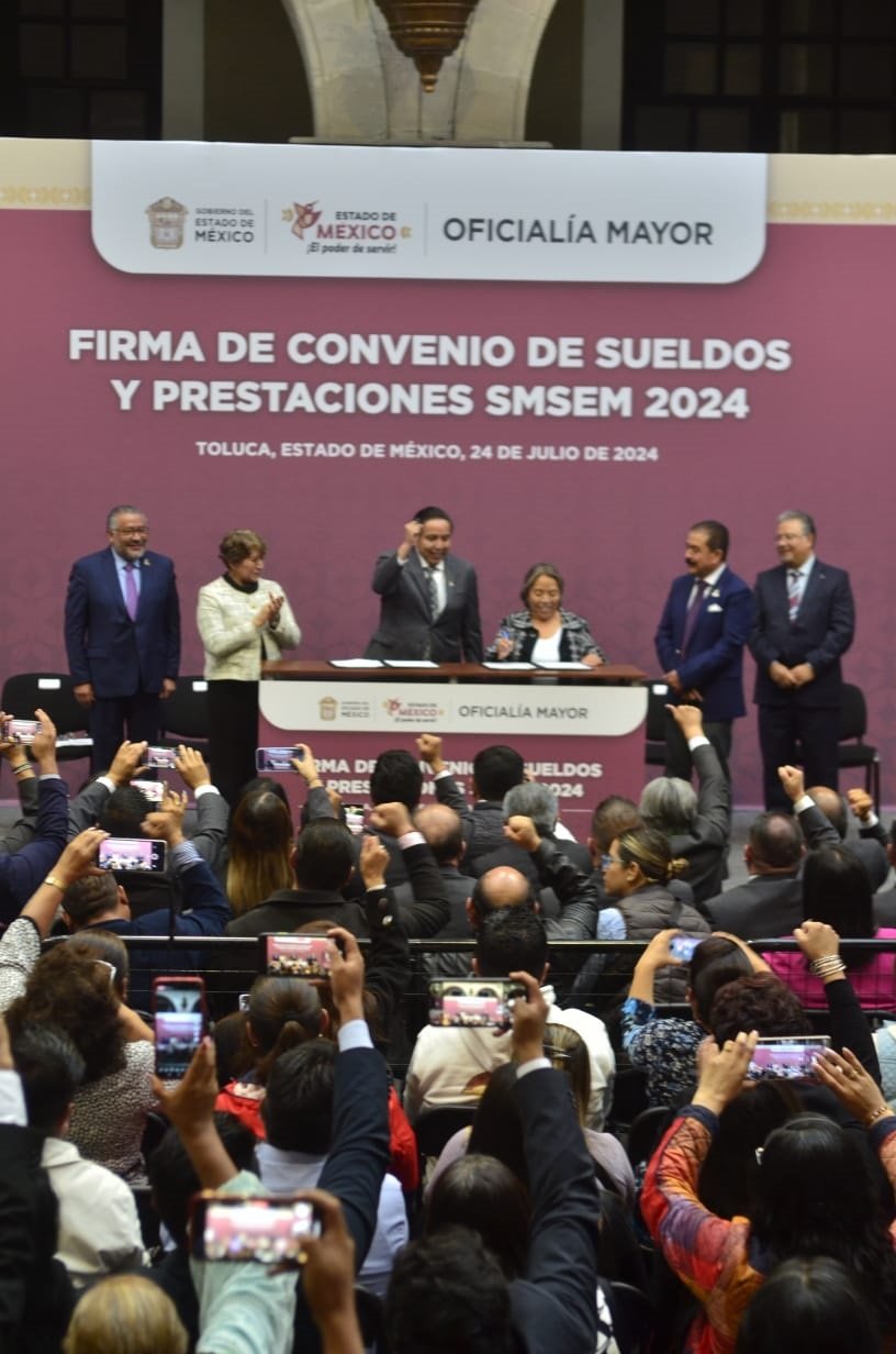 La Gobernadora Delfina Gómez Álvarez encabezó la Firma de Convenio de Sueldos y Prestaciones del Sindicato de Maestros al Servicio del Estado de México (SMSEM) 2024, al mismo tiempo destacó que con un incremento a la remuneración de los servidores públicos docentes, lo cual, no solo se verá reflejado en el sueldo base, sino en prestaciones como útiles escolares, gastos de transporte, material didáctico, despensa, entre otros.