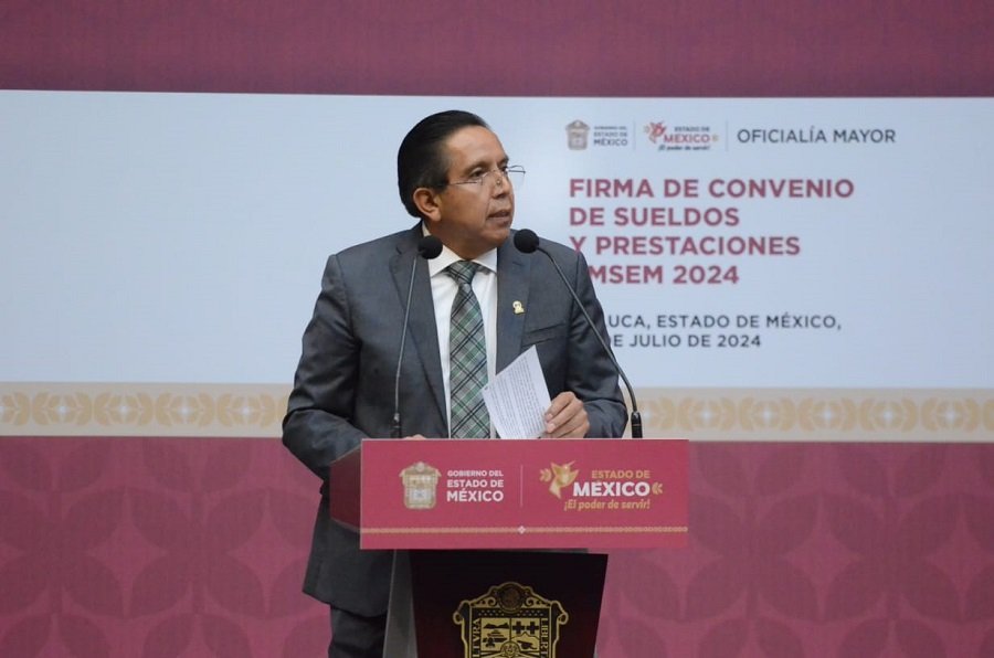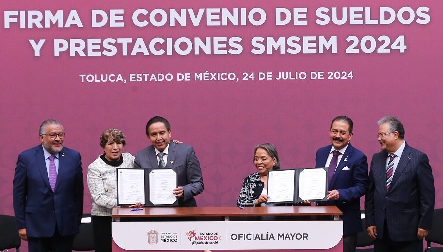 Firmaron el Convenio de Sueldos y Prestaciones del SMSEM, la Oficial Mayor, Trinidad Franco Arpero, y el líder sindical Marco Aurelio Carbajal Leyva, y como testigo de Honor, la Gobernadora Delfina Gómez Álvarez, y el Secretario de Educación, Ciencia, Tecnología e Innovación, Miguel Ángel Hernández Espejel.