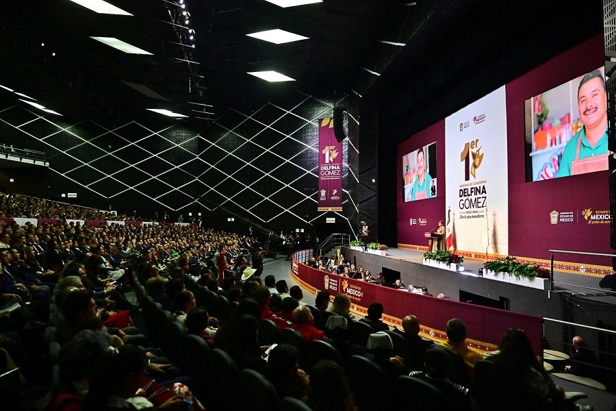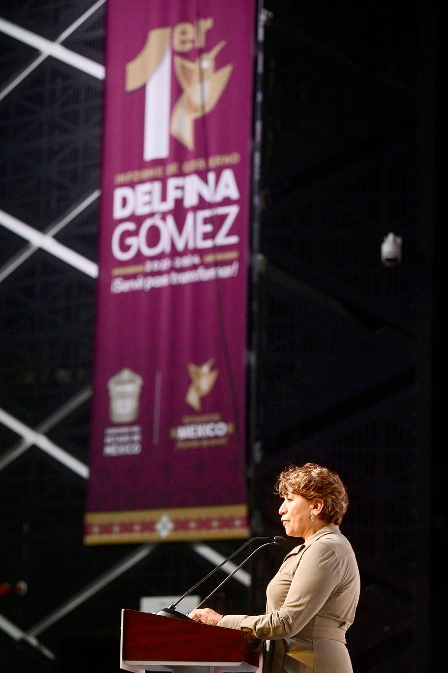 Toluca, Estado de México.- La Gobernadora del Estado de México, Delfina Gómez Álvarez presentó su Primer Informe de Gobierno, un mandato emanado del pueblo que revirtió más de un siglo de rezago social con programas para el bienestar; mejor transporte; más seguridad, educación, salud y nueva obra pública; además cero endeudamiento; atracción de inversión; y generación de empleos.
