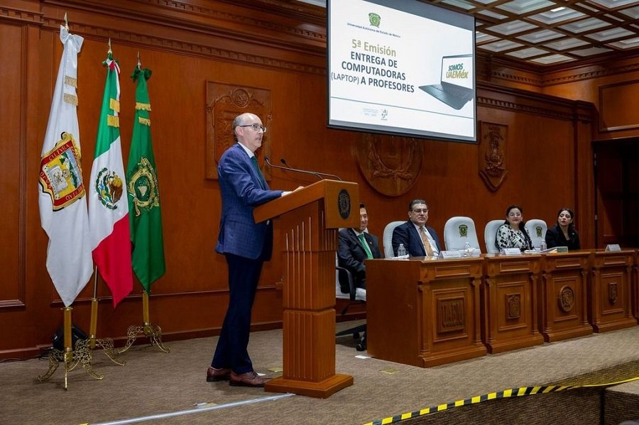 Toluca, Méx; Con el propósito de establecer un proceso de mejora continua en la calidad educativa, a través del uso de las nuevas herramientas tecnológicas y digitales, el rector de la Universidad Autónoma del Estado de México (UAEMéx), Carlos Eduardo Barrera Díaz, presidió la 5° Entrega de computadoras portátiles a profesores de tiempo completo, medio tiempo, técnicos académicos y de asignatura, en la Sala “Benito Juárez García” del Edificio de Rectoría.