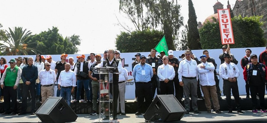 La Plaza Cívica Dr. Gustavo Baz Prada, de Tlalnepantla, fue sede de esta simbólica conmemoración en la que participaron agremiadas y agremiados de la COCEM, CROM, CTM, CTC y del Sindicato Único de Trabajadores de los Poderes, Municipios e Instituciones Descentralizadas del Estado de México (SUTEYM).