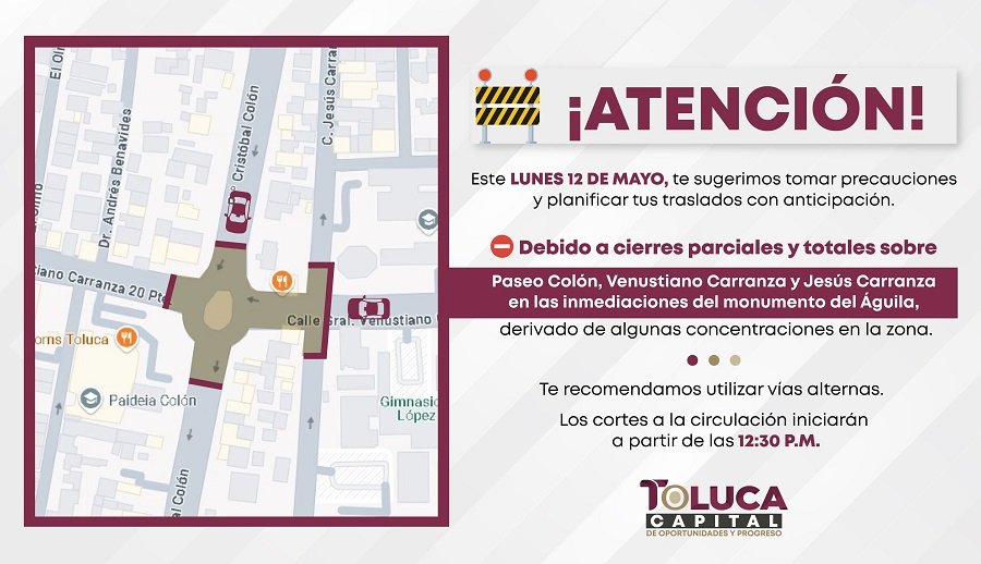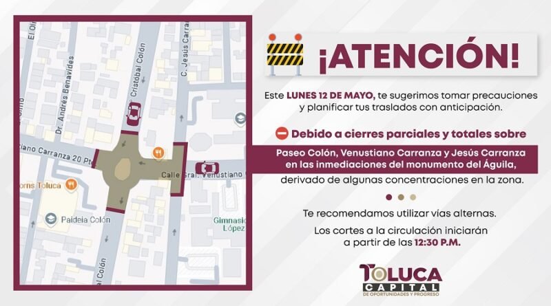 Toluca, Estado de México, Con motivo de concentraciones programadas para este lunes, habrá cierres viales parciales y totales en Paseo Colón, Venustiano Carranza y Jesús Carranza, por lo que la autoridad municipal hace un llamado a la población a anticipar su salida y atender las indicaciones del personal de tránsito.