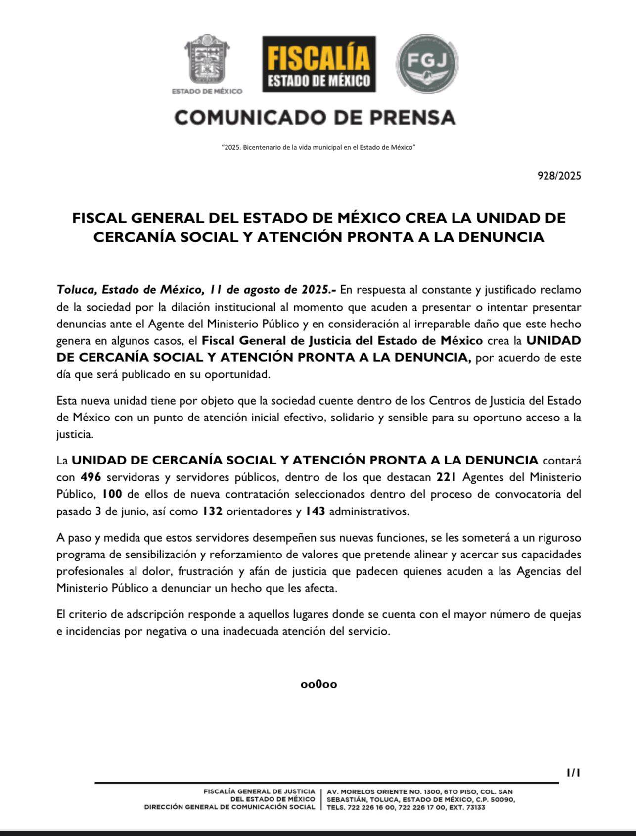 “Fiscal General de Justicia del Estado de México crea la UNIDAD DE CERCANÍA SOCIAL Y ATENCIÓN PRONTA A LA DENUNCIA “