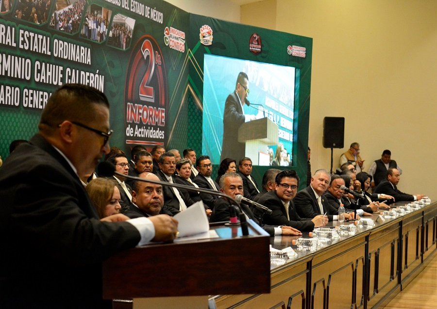 Toluca de Lerdo, Estado de México,.- Herminio Cahue Calderón, secretario general del Sindicato Único de Trabajadores de los Poderes, Municipios e Instituciones Descentralizadas del Estado de México (Suteym), presentó en asamblea general estatal su Segundo Informe de Labores; encuentro en el que manifestó todas las acciones, gestiones, proyectos, avances y estado financiero de la organización.