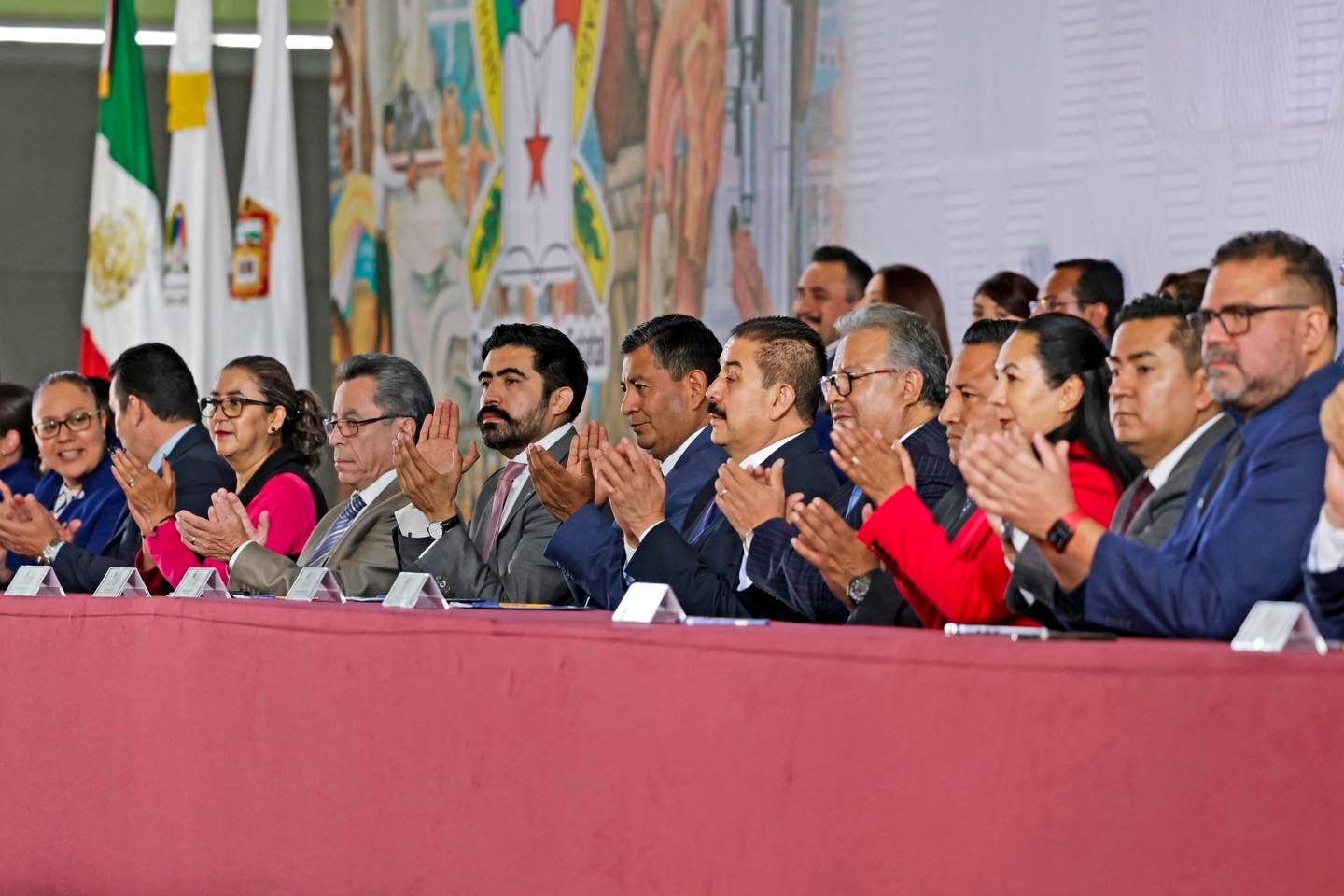 En punto de las diez, el recinto se llenó de aplausos al anunciarse la presencia del Secretario General del SMSEM, Jenaro Martínez Reyes, y del Secretario de Educación, Ciencia, Tecnología e Innovación, Miguel Ángel Hernández Espejel, quien acudió en representación del Gobierno del Estado.