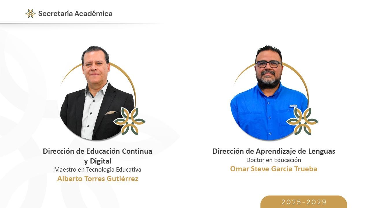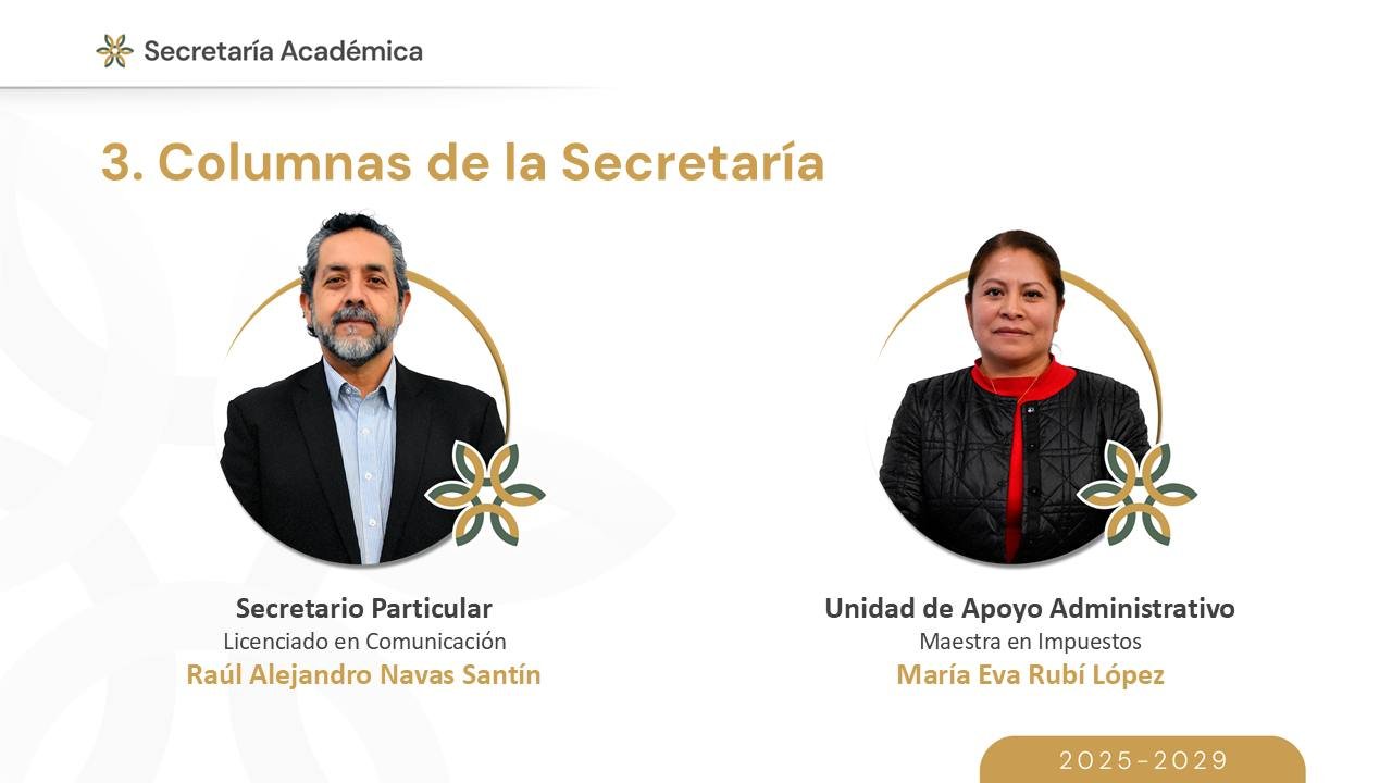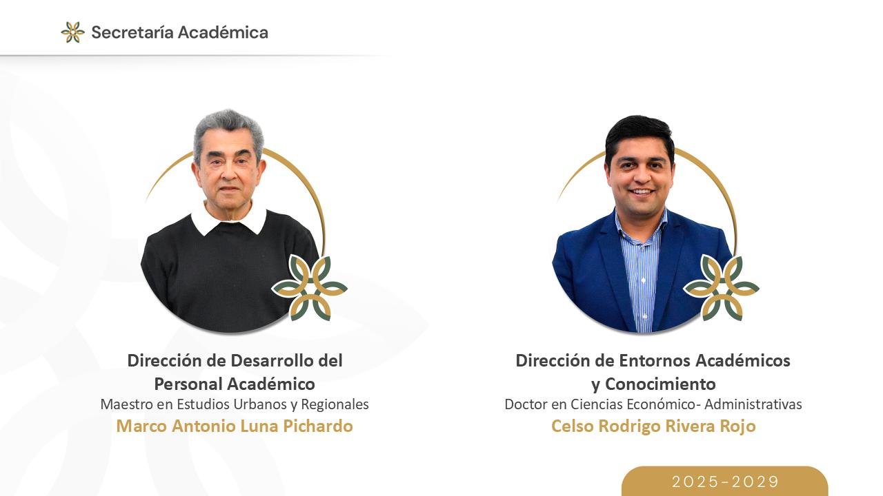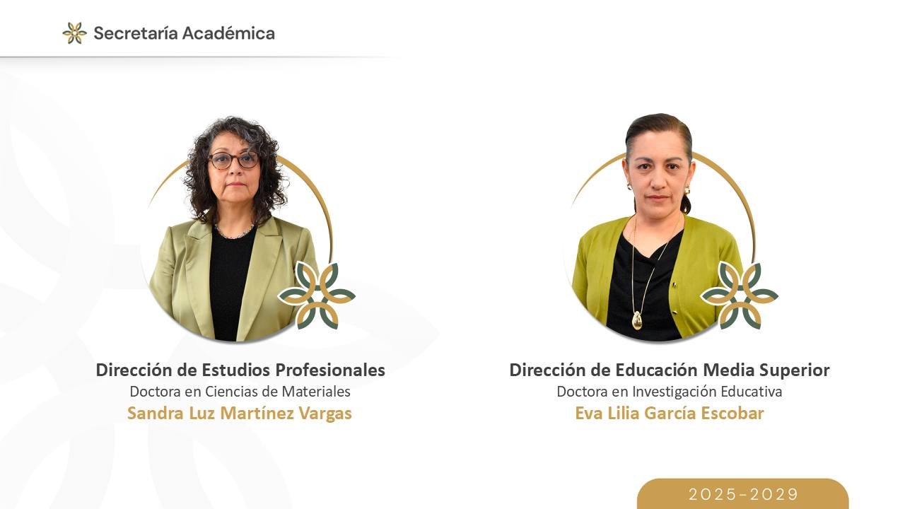 El nuevo equipo está conformado por Raúl Alejandro Navas Santín en la Secretaría Particular; Fabiola Berenice Armeaga Ortiz en la Unidad de Planeación y Gestión de la Calidad; María Eva Rubí López en la Unidad de Apoyo Administrativo; Sandra Luz Martínez Vargas en la Dirección de Estudios Profesionales; Eva Lilia García Escobar en la Dirección de Educación Media Superior; Marco Antonio Luna Pichardo en la Dirección de Desarrollo del Personal Académico; Celso Rodrigo Rivera Rojo en la Dirección de Entornos Académicos y Conocimiento; Juan Carlos Matadamas Gómez en la Dirección de Servicios Escolares; Yenit Martínez Garduño en la Dirección Académica del Sistema Incorporado; Alberto Torres Gutiérrez en la Dirección de Educación Continua y Digital; Omar Steve García Trueba en la Dirección de Aprendizaje de Lenguas; y Sandra Galván Mares en la Dirección de Acompañamiento Estudiantil.