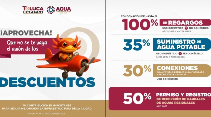 Toluca, Estado de México, – La ciudadanía puede aprovechar los descuentos vigentes en el servicio de agua potable y regularizar sus adeudos, pues con las bonificaciones que ofrece el Gobierno municipal, los usuarios cumplidos contribuyen a fortalecer los servicios públicos para el beneficio de la población.