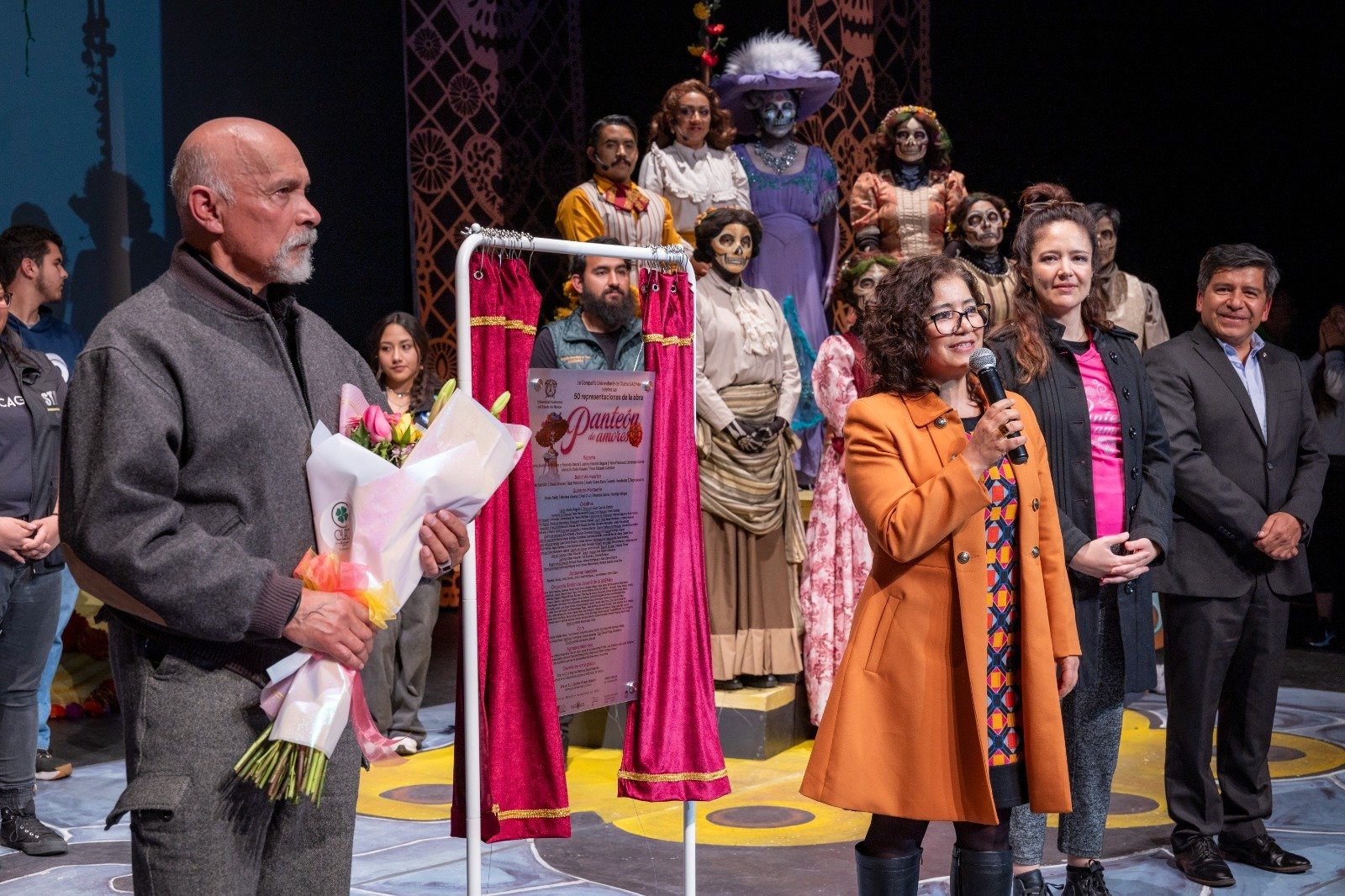 Al develar la placa conmemorativa a las cincuenta presentaciones de la obra, acompañada de la secretaria de Identidad y Cultura Universitaria, Cynthia Ortega Salgado, la rectora destacó la sinergia de las distintas instituciones que hicieron posible este montaje y resaltó que el trabajo conjunto genera una valiosa retribución social.