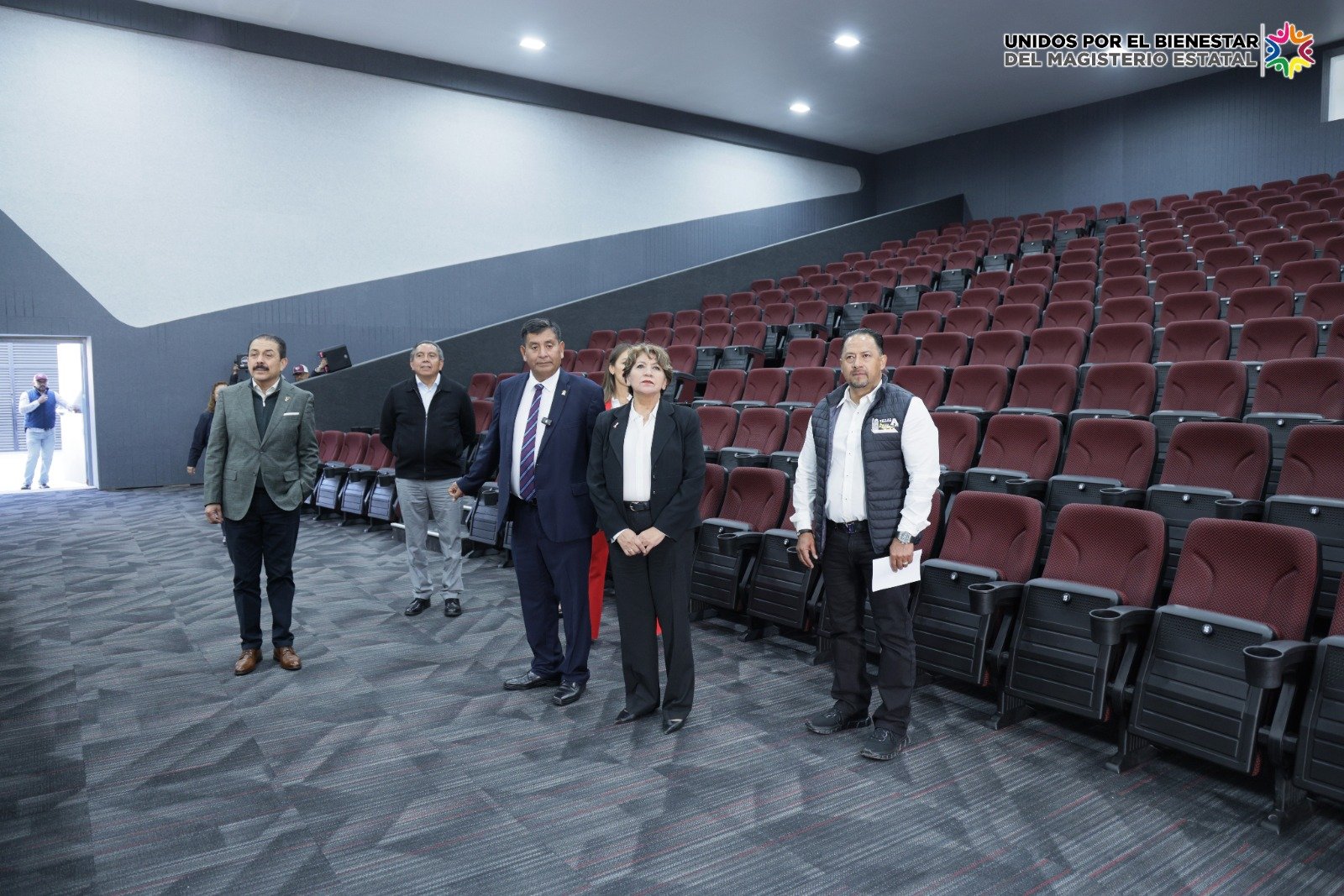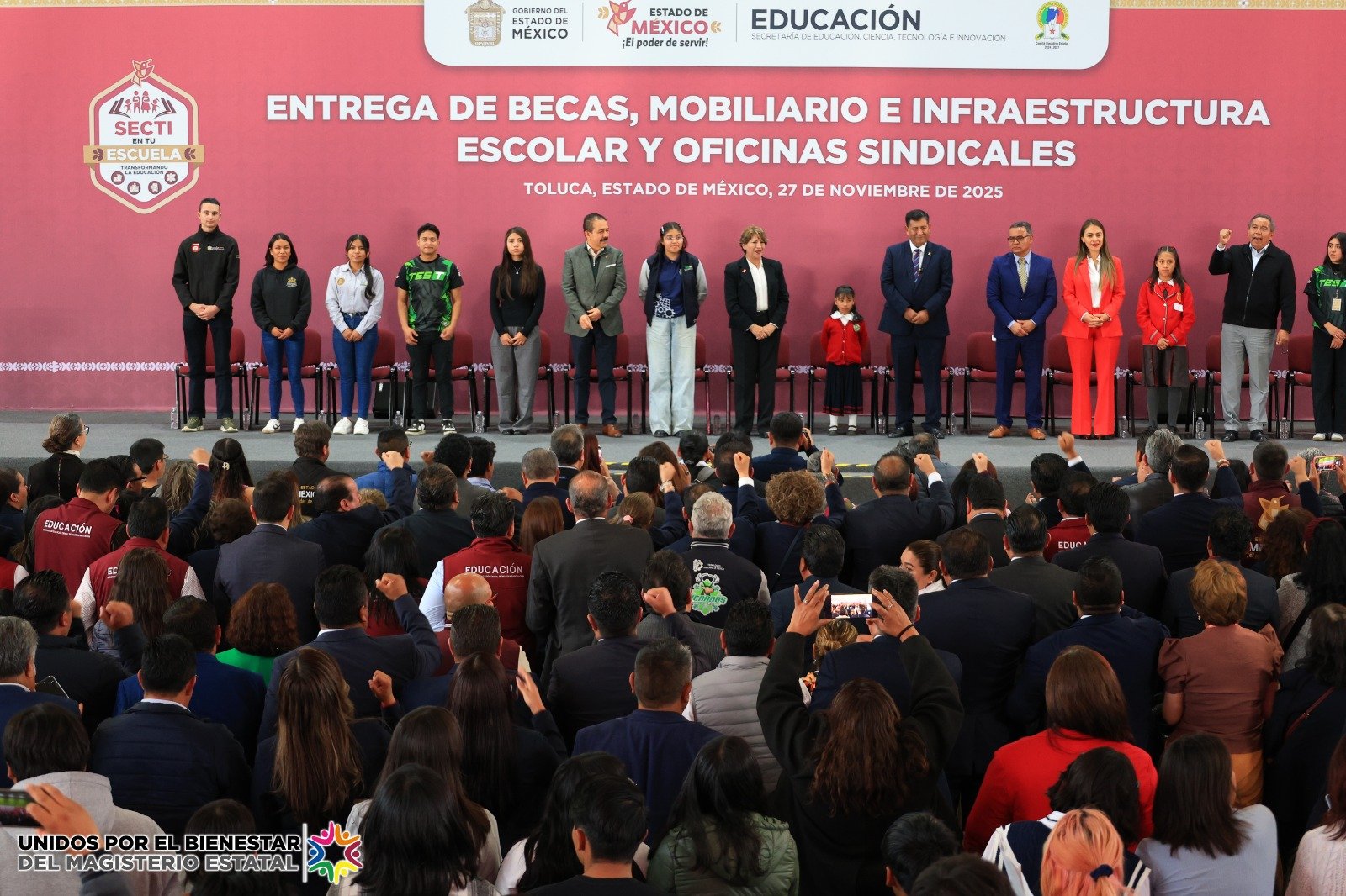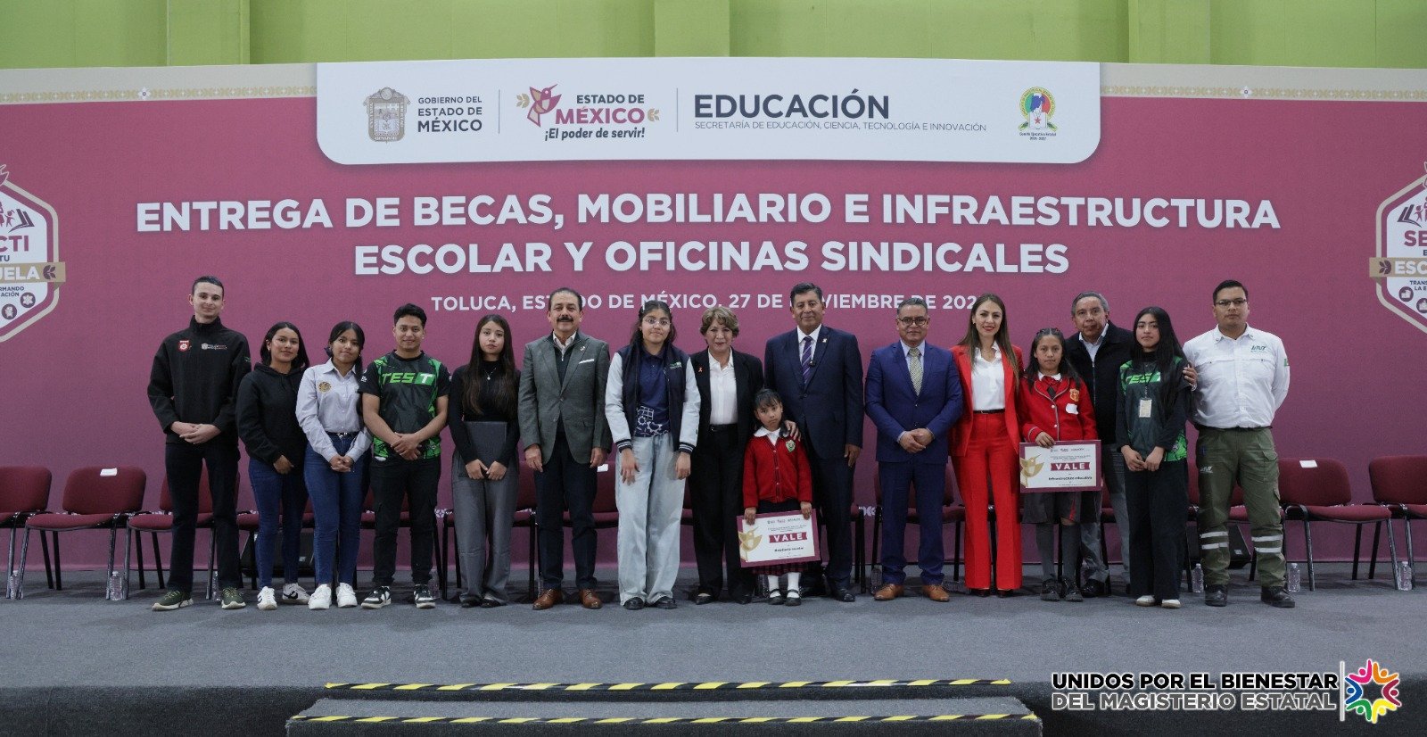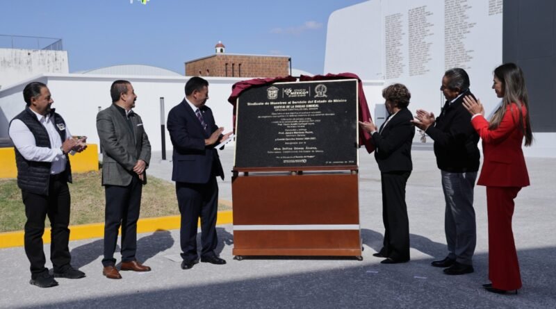 Toluca, Estado de México, .-La gobernadora Delfina Gómez Álvarez inauguró el Edificio de la Unidad Sindical del Sindicato de Maestros al Servicio del Estado de México (SMSEM), acompañada por el Secretario General, Jenaro Martínez Reyes. Tras el recorrido y la develación de placas, la mandataria encabezó en el Auditorio “Prof. Agripín García Estrada” la entrega de becas de la Olimpiada del Conocimiento, apoyos para estudiantes de educación superior, así como vales de obra y mobiliario escolar.