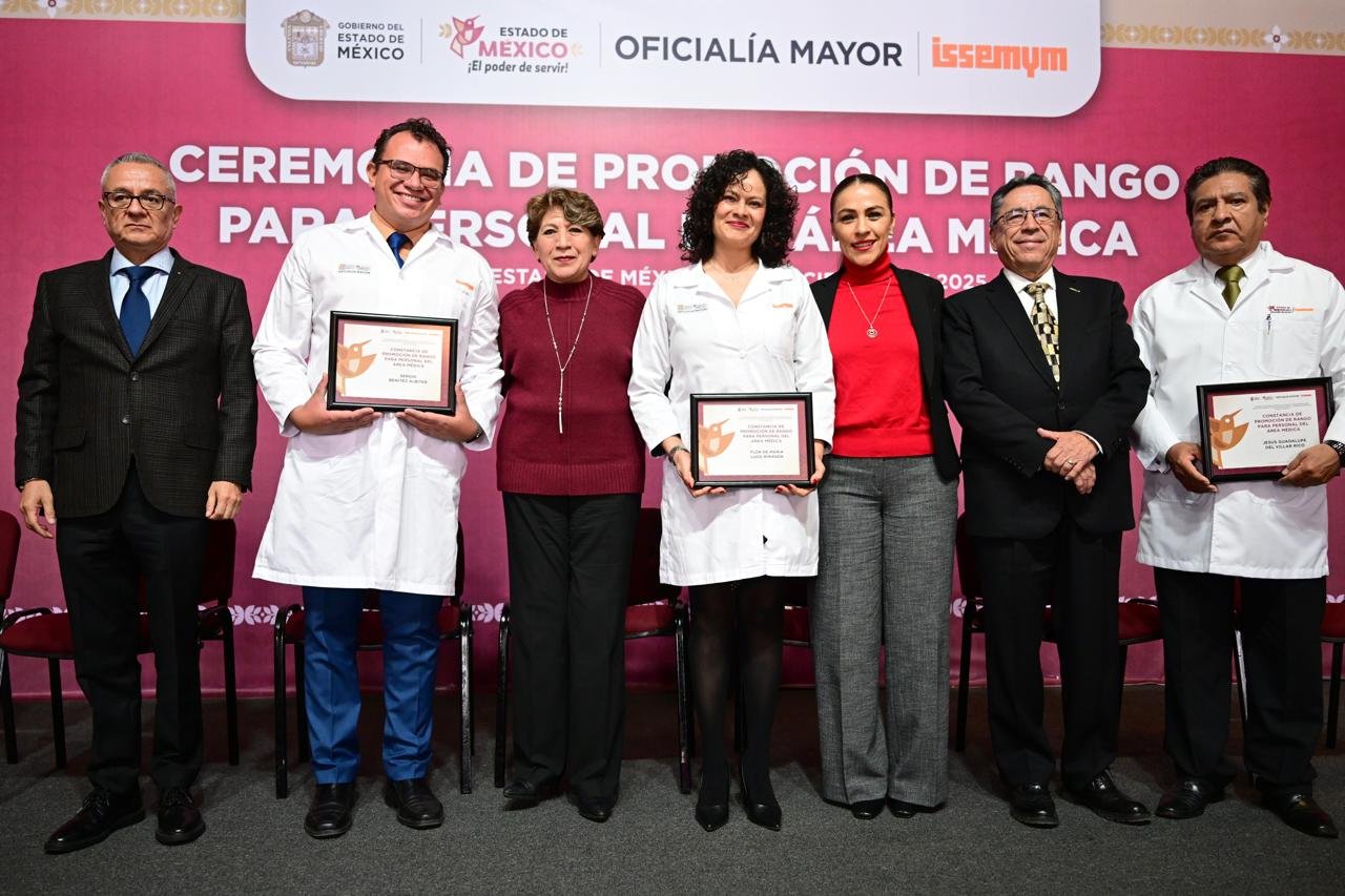 TOLUCA, Estado de México.- La Gobernadora Delfina Gómez Álvarez entregó constancias de promoción de nivel o rango salarial a personas servidoras públicas del área médica del Instituto de Seguridad Social del Estado de México y Municipios (ISSEMYM), como parte del Programa de Recategorizaciones y Estabilización Salarial.