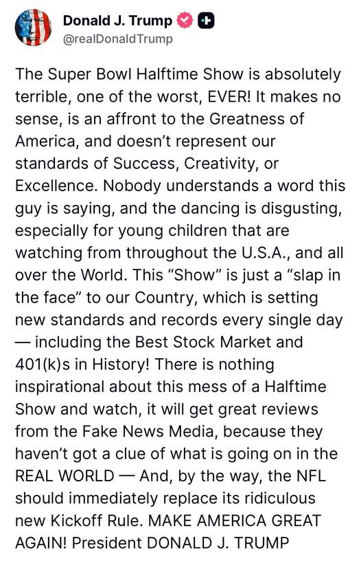 “El Super Bowl Halftime Show es absolutamente terrible, ¡uno de los peores de la historia! No tiene sentido, es una afrenta a la Grandeza de América y no representa nuestros estándares de Éxito, Creatividad o Excelencia. Nadie entiende ni una palabra que este tipo está diciendo, y el baile es asqueroso, especialmente para los niños pequeños que están viendo desde todo Estados Unidos y de todo el mundo. Este «Espectáculo» es solo una «bofeteada» a nuestro país, que está estableciendo nuevos estándares y récords todos los días, ¡incluido el mejor mercado de valores y 401(k)s de la historia! No hay nada inspirador en este lío de un espectáculo de medio tiempo y ver, recibirá excelentes críticas de los medios de noticias falsas, porque no tienen ni idea de lo que está sucediendo en el MUNDO REAL, y, por cierto, la NFL debería reemplazar inmediatamente su nueva y ridícula regla de patada. ¡HAZ QUE ESTADOS UNIDOS VUELVA A SER GRANDE! El presidente DONALD J. Triunfo”