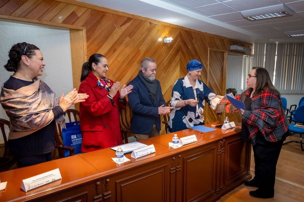 Toluca, Méx. –En la Sala de Titulación “Arq. León Abraham León Lara” de la Facultad de Arquitectura y Diseño de la Universidad Autónoma del Estado de México (UAEMéx) se llevó a cabo la entrega de reconocimientos a integrantes de la Cátedra UNESCO–Universidad e Integración Regional (UNEIR), espacio académico dedicado a la investigación, innovación, formación, difusión y asesoría en materia de sistemas y políticas de educación superior en Iberoamérica.