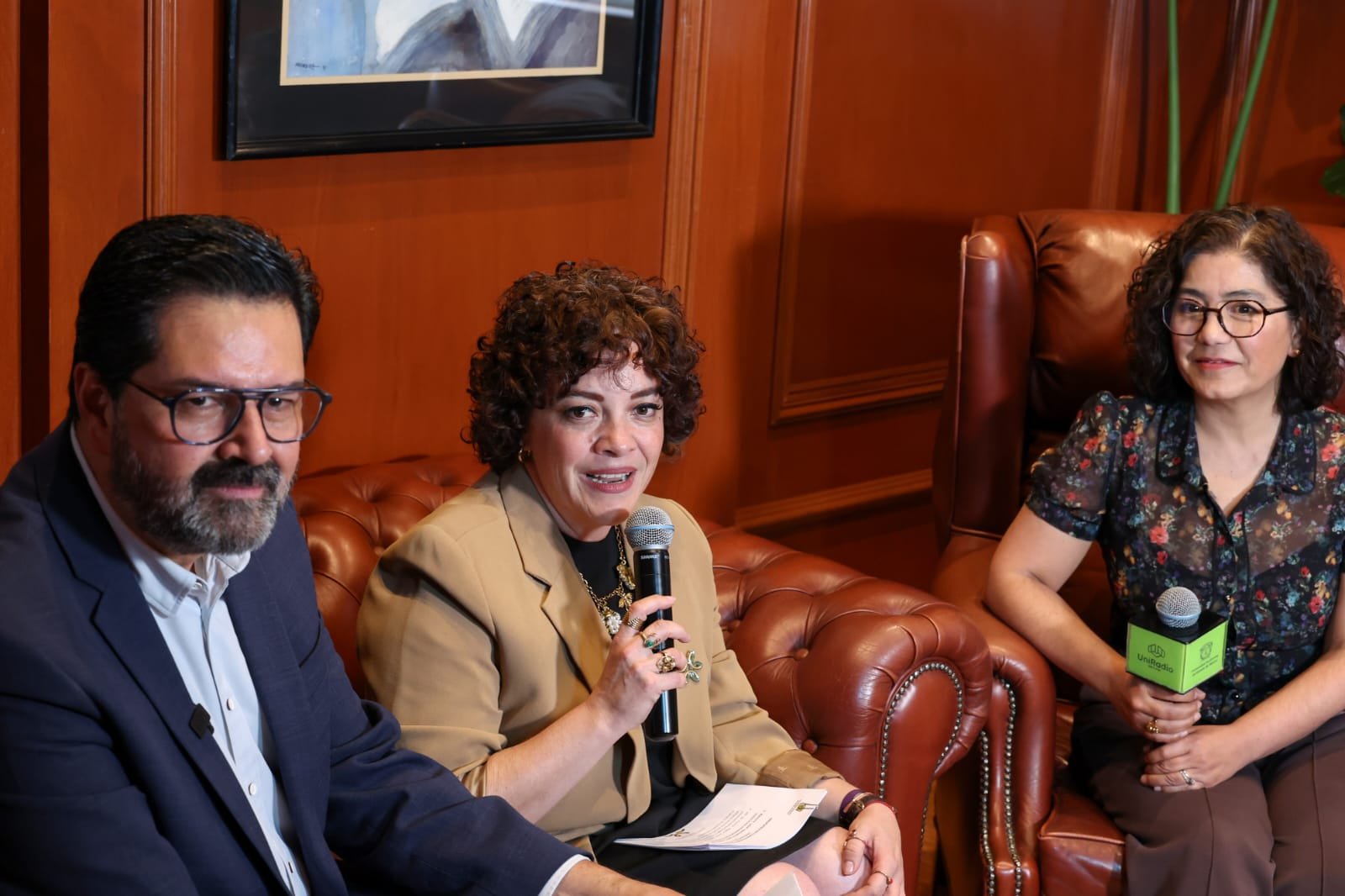 Bajo la moderación del director de la emisora, Gastón Pedraza Muñoz, y de la reportera y conductora Daniela Sandoval Álamo, la rectora reconoció que UniRadio genera espacios incluyentes para escuchar a los distintos sectores que integran la comunidad universitaria auriverde, consolidándose como un entorno dedicado a la comunicación, el diseño y el periodismo de calidad, que da cuenta del quehacer cotidiano de la institución.