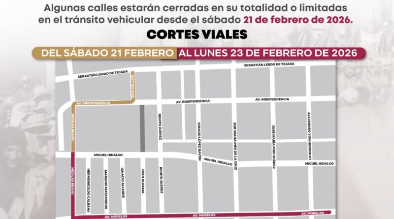Las calles que permanecerán cerradas en su totalidad son Riva Palacio, desde Sebastián Lerdo de Tejada hasta avenida Independencia; y avenida Independencia, en el tramo comprendido entre Riva Palacio y Nicolás Bravo.