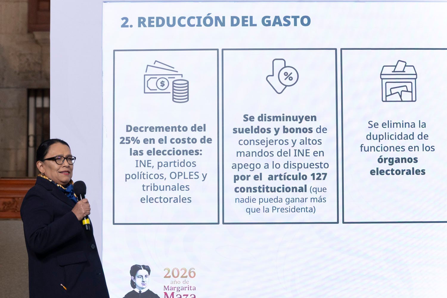 La reducción de 25 por ciento en el ámbito electoral incluye gastos del Instituto Nacional Electoral (INE), tribunales y salarios de los consejeros, así como desaparición completa de áreas innecesarias, disminución de recursos a partidos políticos y a los OPLE.