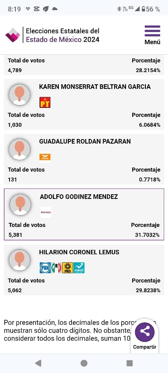 De acuerdo al Programa Electoral de Resultados Preliminares (PREP) del Instituto Electoral del Estado de México IEEM, Adolfo Godínez Méndez, virtual presidente electo en Otumba, mantiene la ventaja con 5 mil 381 votos, lo que representa el 31.7 por ciento, contra el 29.8 por ciento que significan para el priista 5 mil 062 votos.
