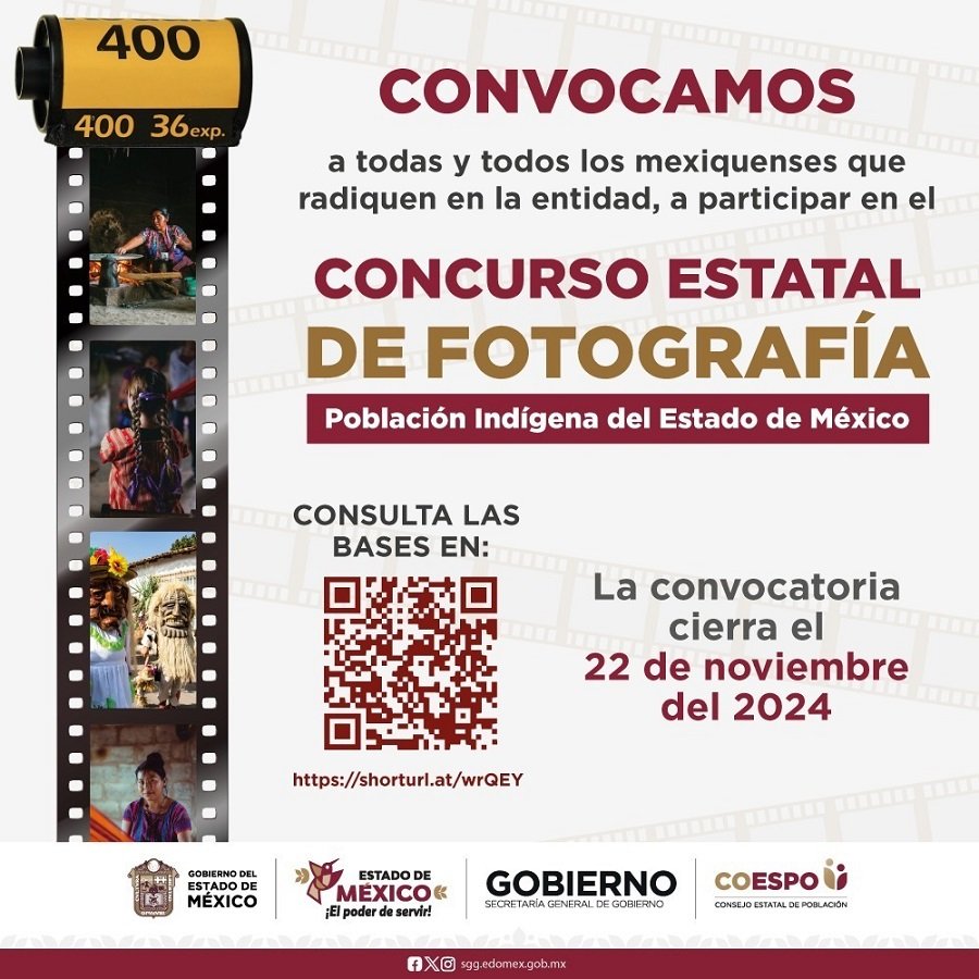 TOLUCA, Estado de México.- La Secretaría General de Gobierno, a través del Consejo Estatal de Población (Coespo) invita a las y los mexiquenses de todas las edades que radiquen en la entidad, a participar en el Concurso Estatal de Fotografía “Población Indígena del Estado de México”.