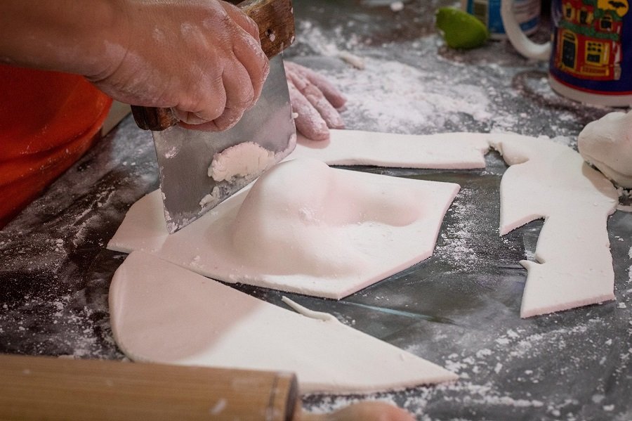 Se estira y se le da forma de animales como borregos, puercos, caballos, unicornios, conejos, con moldes a mitades, también de barro; se seca durante varios días, se unen las dos mitades, se elaboran también las cabezas, extremidades y se les adhieren. Finalmente se decoran.