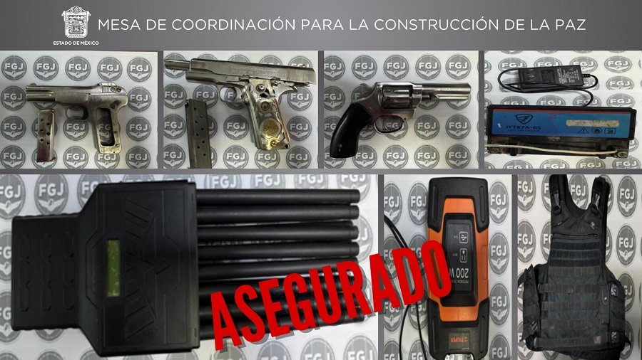 Al advertir la situación, elementos de la FGJEM iniciaron una persecución que concluyó con la detención de los siete individuos, así como el aseguramiento de tres armas de fuego, dos vehículos, un inhibidor de señal de 16 antenas y un dispositivo de carga eléctrica.