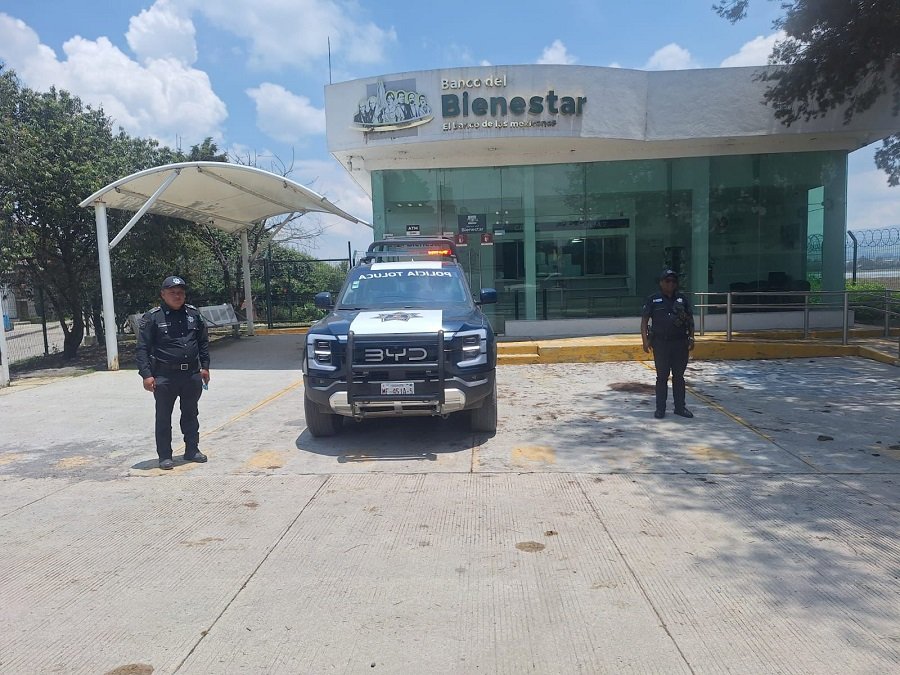 En Santiago Tlacotepec y San Pablo Autopan se implementó el Operativo Bancario Edificio Seguro en las instalaciones del Banco del Bienestar, con presencia permanente de la Policía Municipal para disuadir actos delictivos y proteger a usuarios y trabajadores.