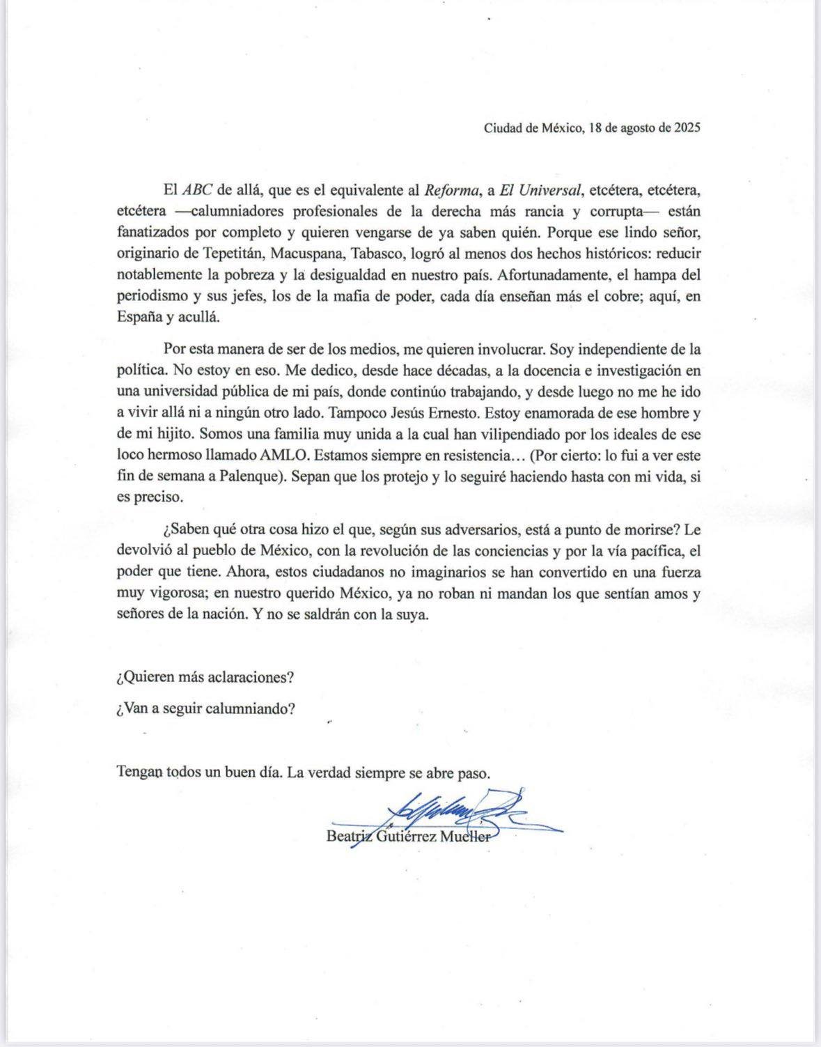 Beatriz Gutiérrez Mueller , esposa de Andrés Manuel López Obrador, publica una carta en sus redes sociales en donde afirma que: “no me he ido a vivir allá ni a ningún otro lado” , en referencia a lo publicado por el diario español ABC :