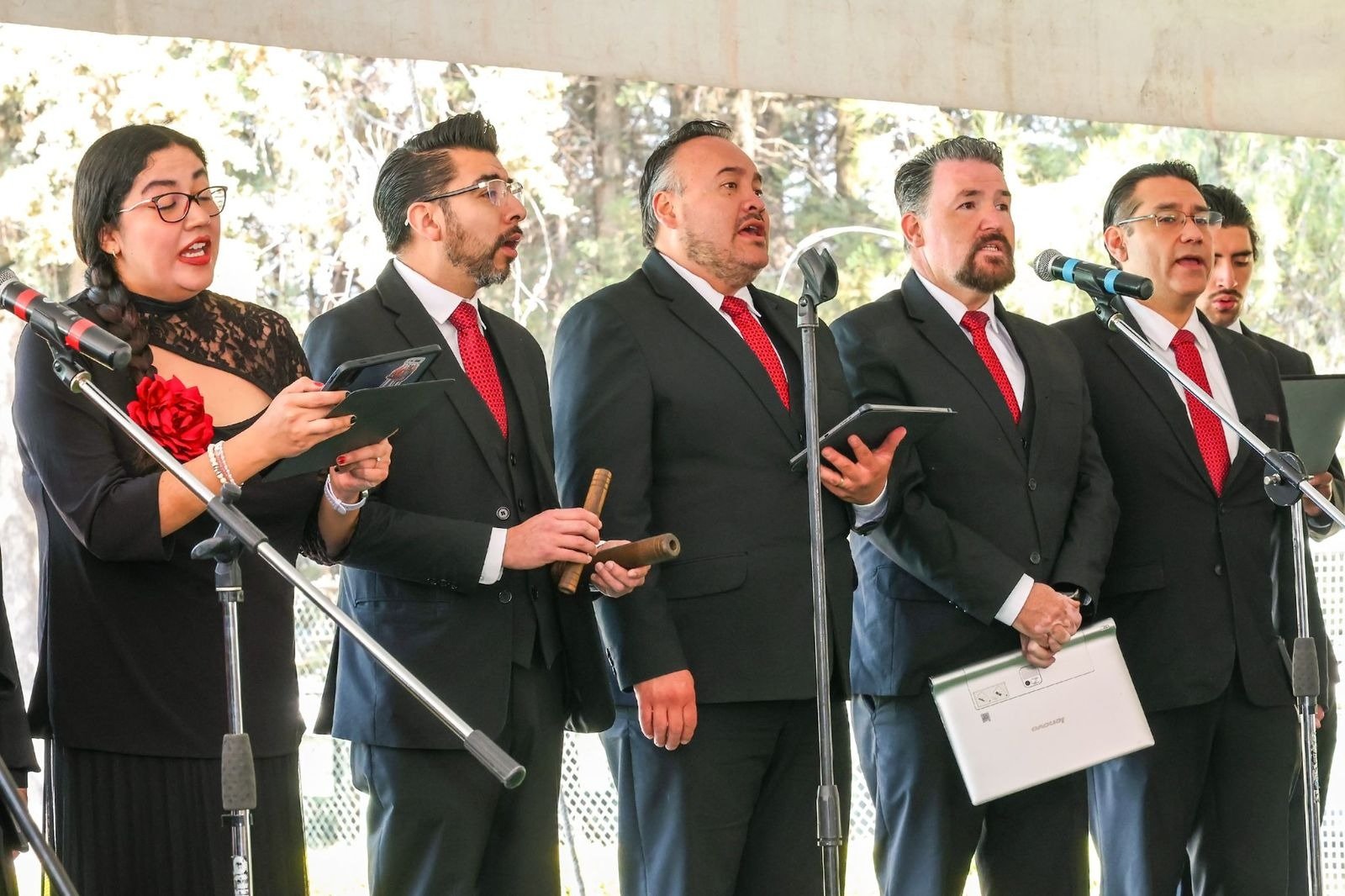 El programa artístico inició con la participación del Coro Universitario de la UAEMéx, bajo la dirección de Emilio Hernández, que interpretó un repertorio integrado por clásicos del bolero, la salsa y el mariachi, provenientes de diversos países de Latinoamérica, creando una atmósfera de nostalgia y romanticismo que cautivó al público.