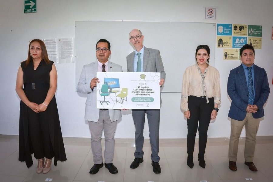 Acompañado de la secretaria de Administración de la institución, Eréndira Fierro Moreno, también hizo entrega de 15 computadoras de última generación, 50 pupitres y 15 sillas para personal administrativo; Barrera Díaz resaltó que la Administración 2021-2025 de la UAEMéx está siempre atenta a las necesidades de la comunidad universitaria.