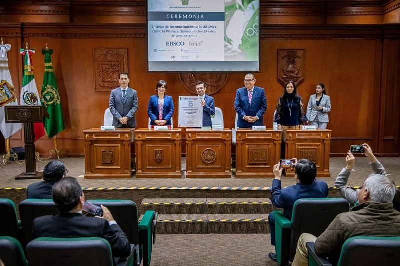 Toluca, Méx; Por ser la primera universidad en México en implementar Folio, el sistema de administración para bibliotecas, la Universidad Autónoma del Estado de México (UAEMéx) recibió un reconocimiento de la empresa EBSCO, quien destacó su compromiso con la innovación e impulso al uso de herramientas que fortalecen la investigación y consulta académicas.