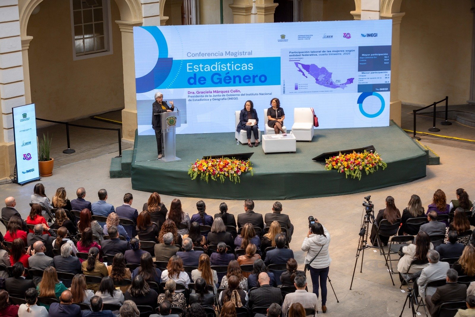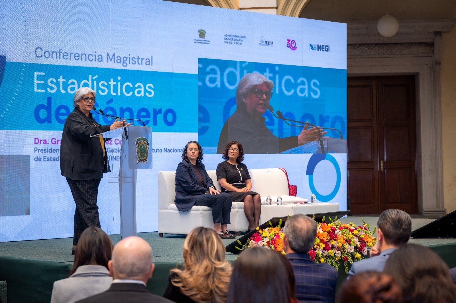 • En conferencia magistral en la Universidad Autónoma del Estado de México, la presidenta de la Junta de Gobierno del Instituto Nacional de Estadística y Geografía, Graciela Márquez Colín, habló de la importancia de generar estadística con perspectiva de género para alcanzar la igualdad sustantiva y la disminución de las brechas de género.